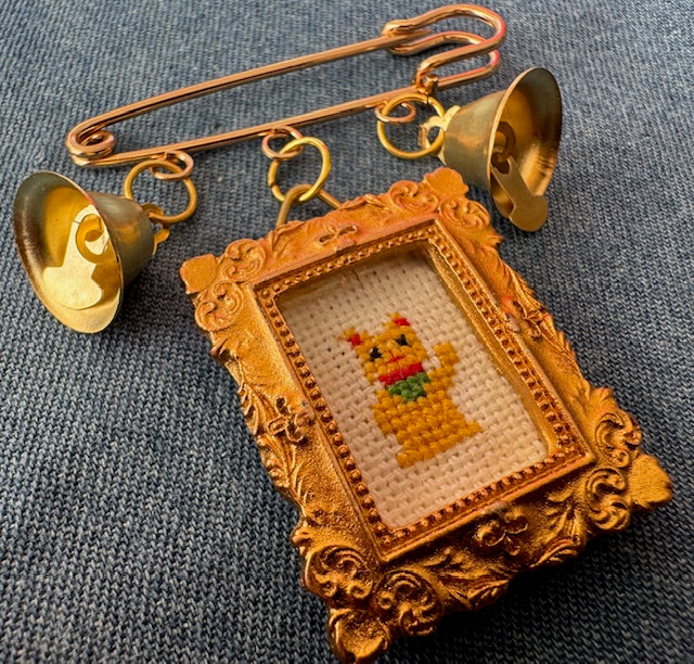 The fanciest little pin for displaying the tiniest cross stitch in the tiniest gold frame—the one you heroically stitched with your superior eyesight and impeccable talent. A place for your collected trinkets (or use the ones included). Enjoy the bragging rights that come from casually wearing your skills on your lapel.